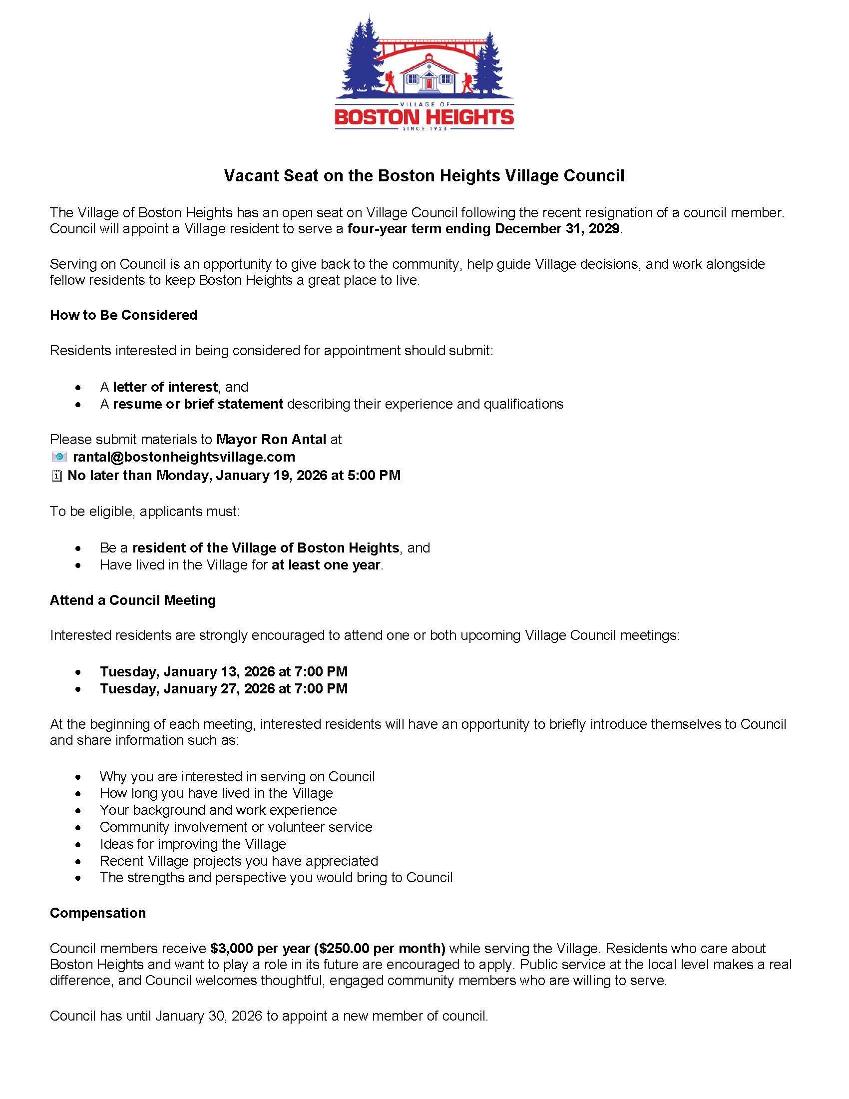 To the Residents of Boston Heights, Thank you for your support and for re-electing me to the Village Council.